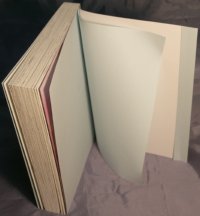 | また従来どおり一枚(表裏2ページ分)づつの紙を束ねる際に、一定枚数ごとに先に多量の糊をのどの部分に流し込んでおいて強度を増したものもあります。 | ||