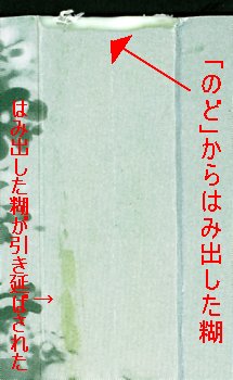 | 製本糊は「のど」の部分に染み込んでいる為、ページ紙に付着した糊を除去する事はできません。 |
